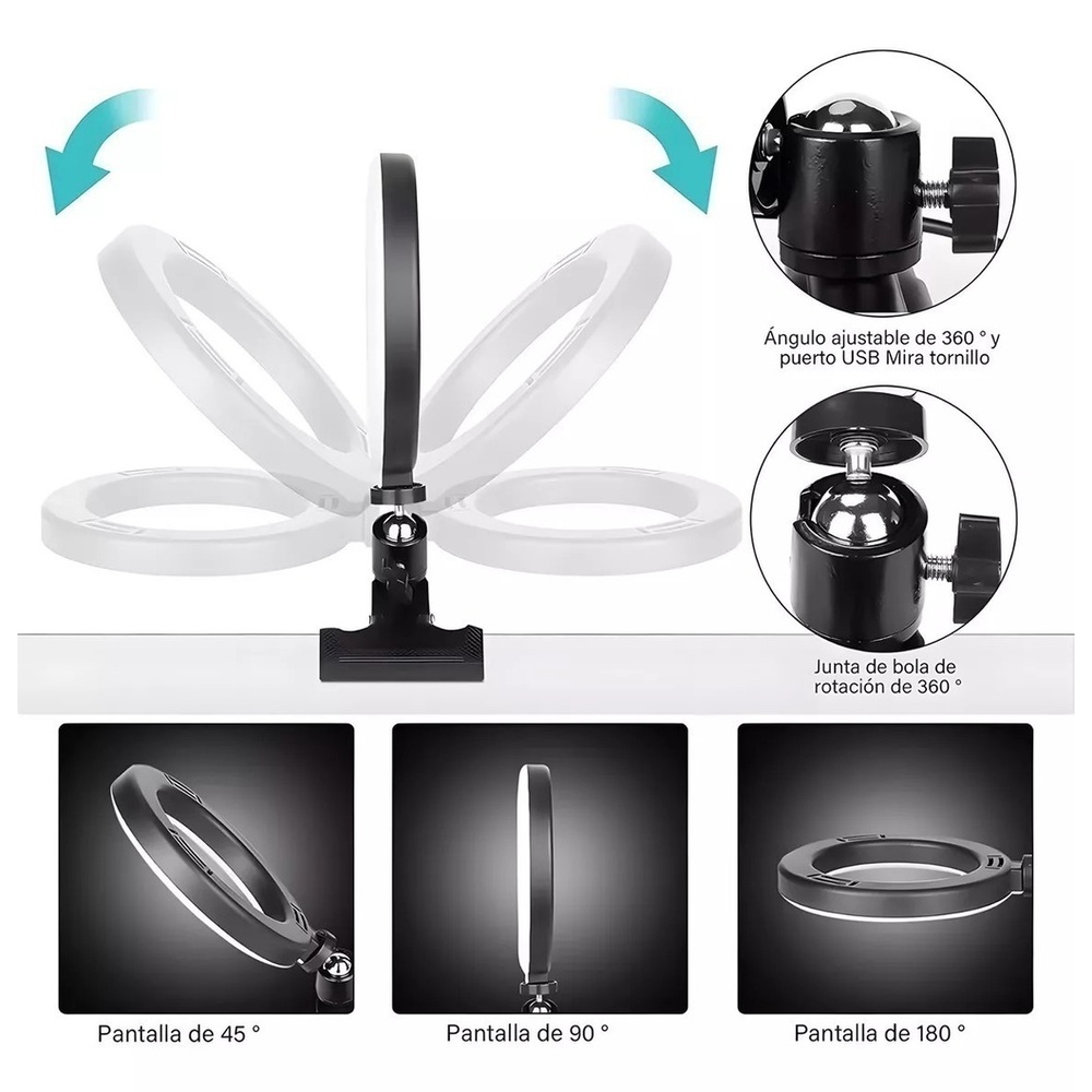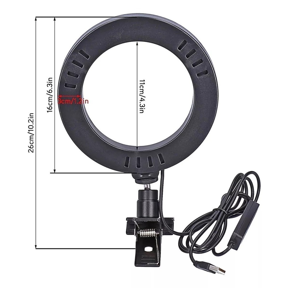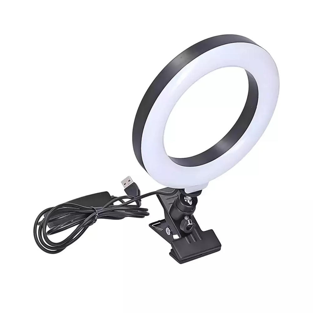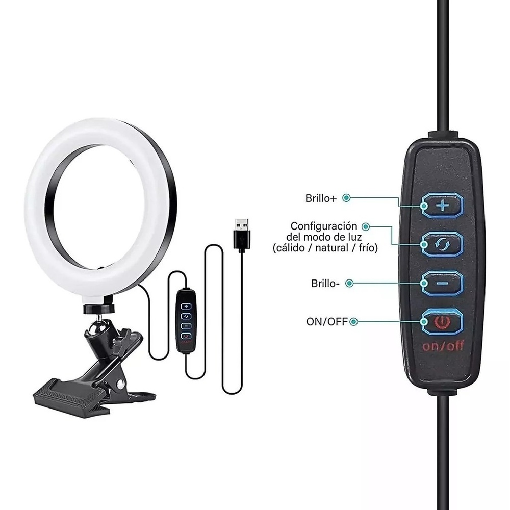Aro de luz LED de 16 cm con clip giratorio 360°. 3 modos de luz, alimentación USB, ideal para maquillaje, streaming y fotografía profesional.