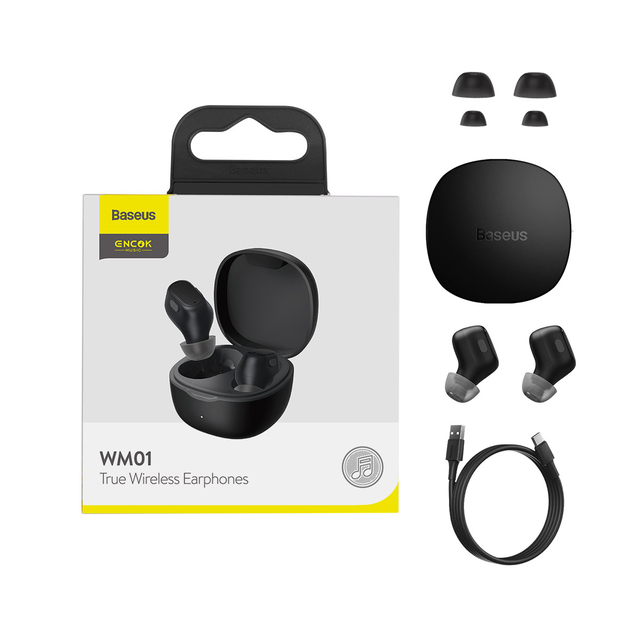Auriculares inalámbricos Baseus WM01 con Bluetooth 5.0, diseño compacto y hasta 25 h de autonomía con estuche de carga. Sonido nítido, controles táctiles y emparejamiento automático.