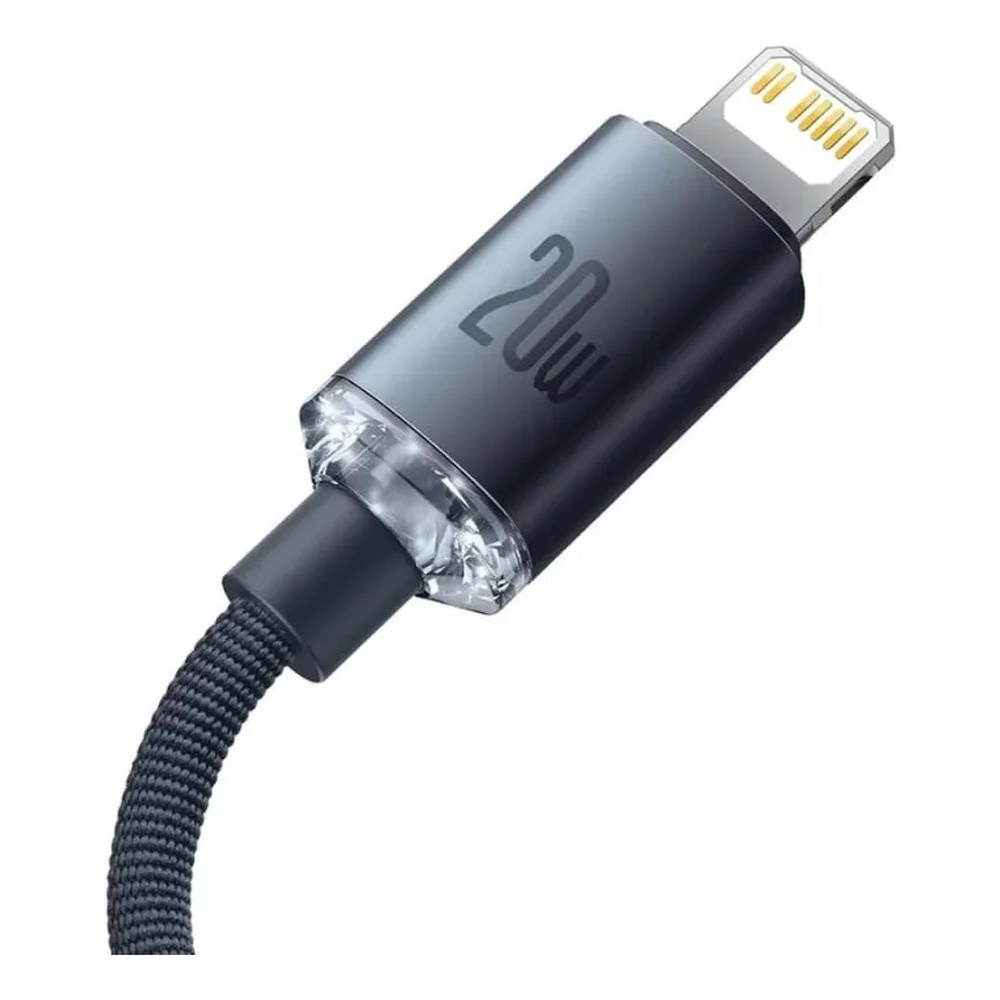 Cable Baseus Crystal Shine USB-C a Lightning de 1.2m. Carga rápida de hasta 20W y transferencia de datos a 480 Mbps. Diseño resistente y elegante.