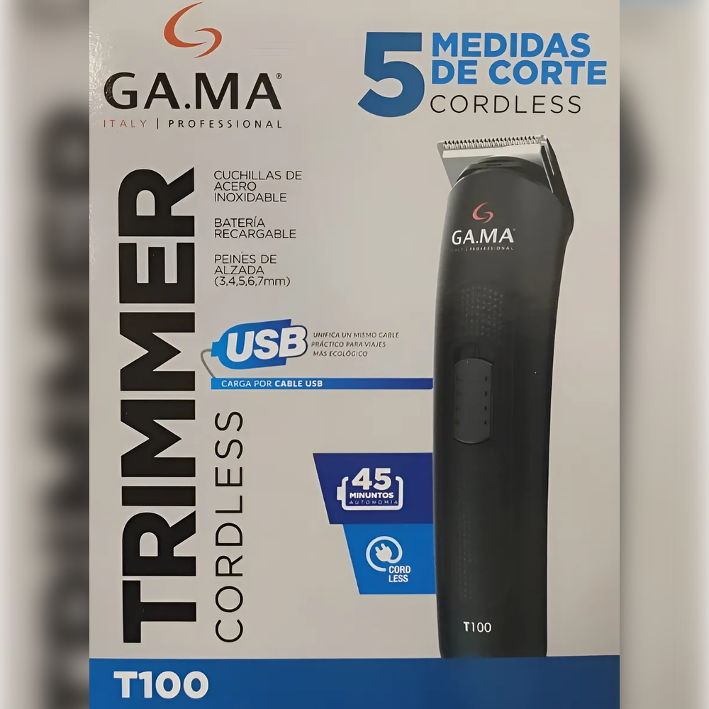 Cortadora Gama Trimmer T100 recargable y versátil. Perfecta para contornos y retoques precisos con cuchillas de acero inoxidable y diseño ergonómico.