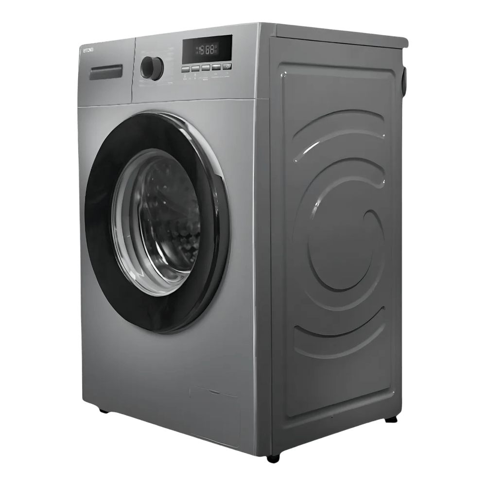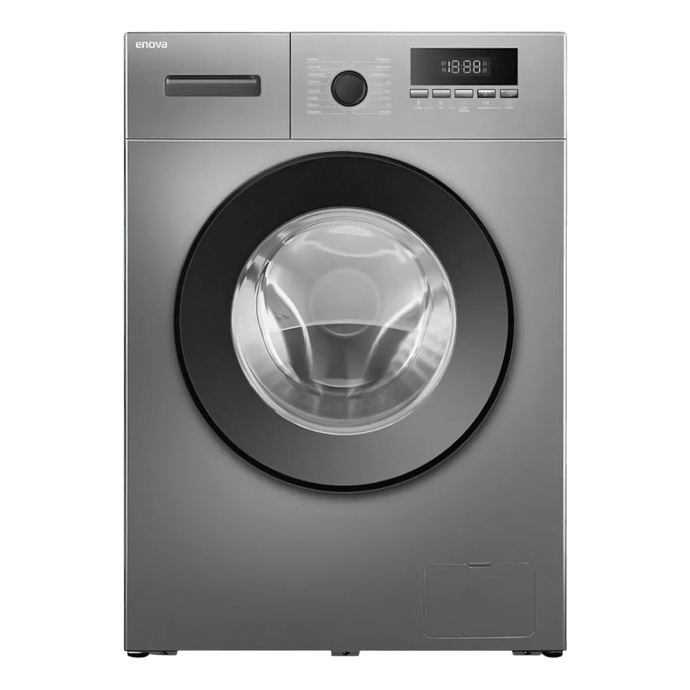 Lavarropas Enova de 8 kg con motor Inverter y 1400 rpm, eficiente y silencioso, con múltiples programas y diseño moderno en color gris.