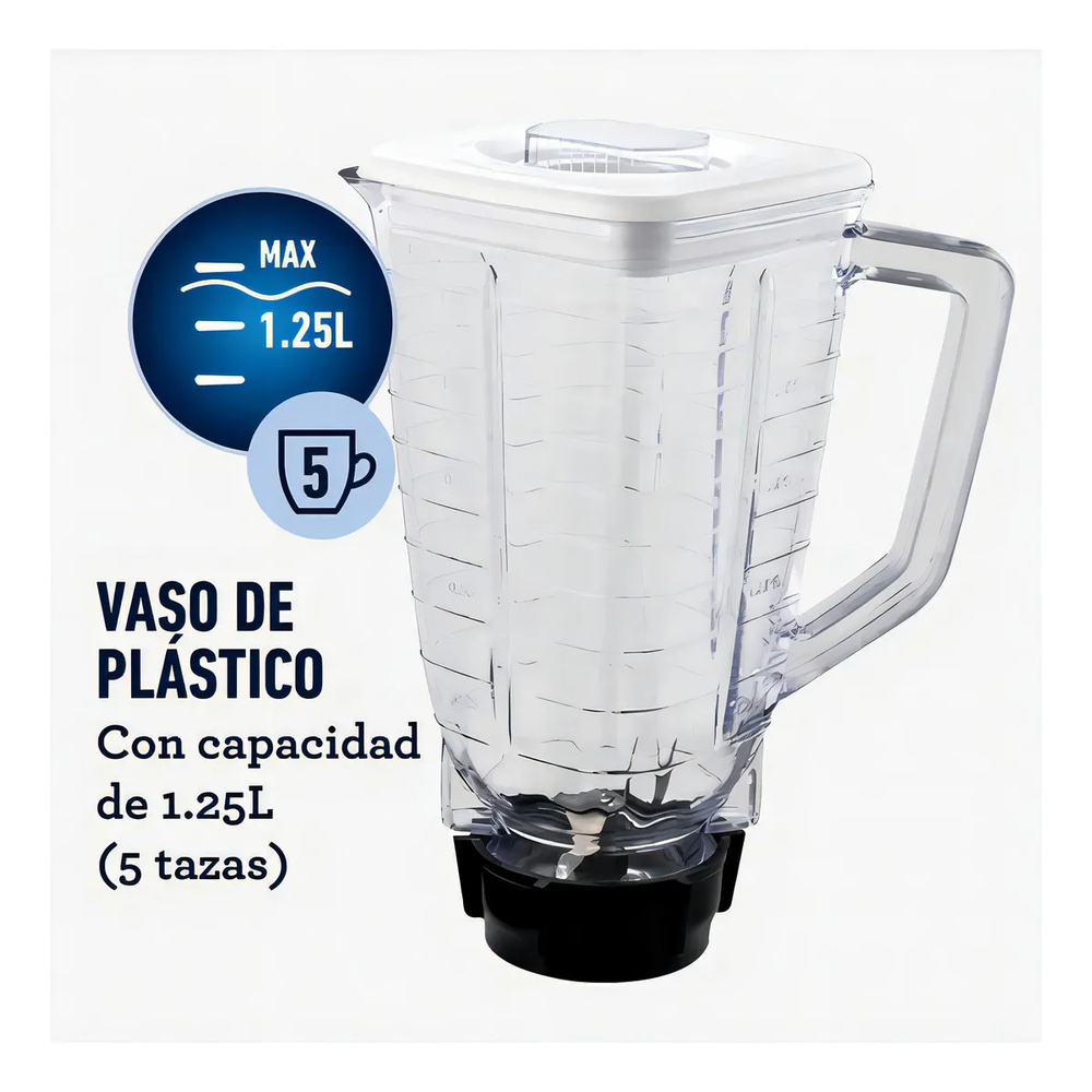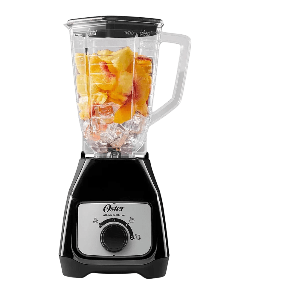 Licuadora Oster de 1.25 L con jarra plástica resistente y cuchillas de acero inoxidable, práctica y funcional para el uso diario.