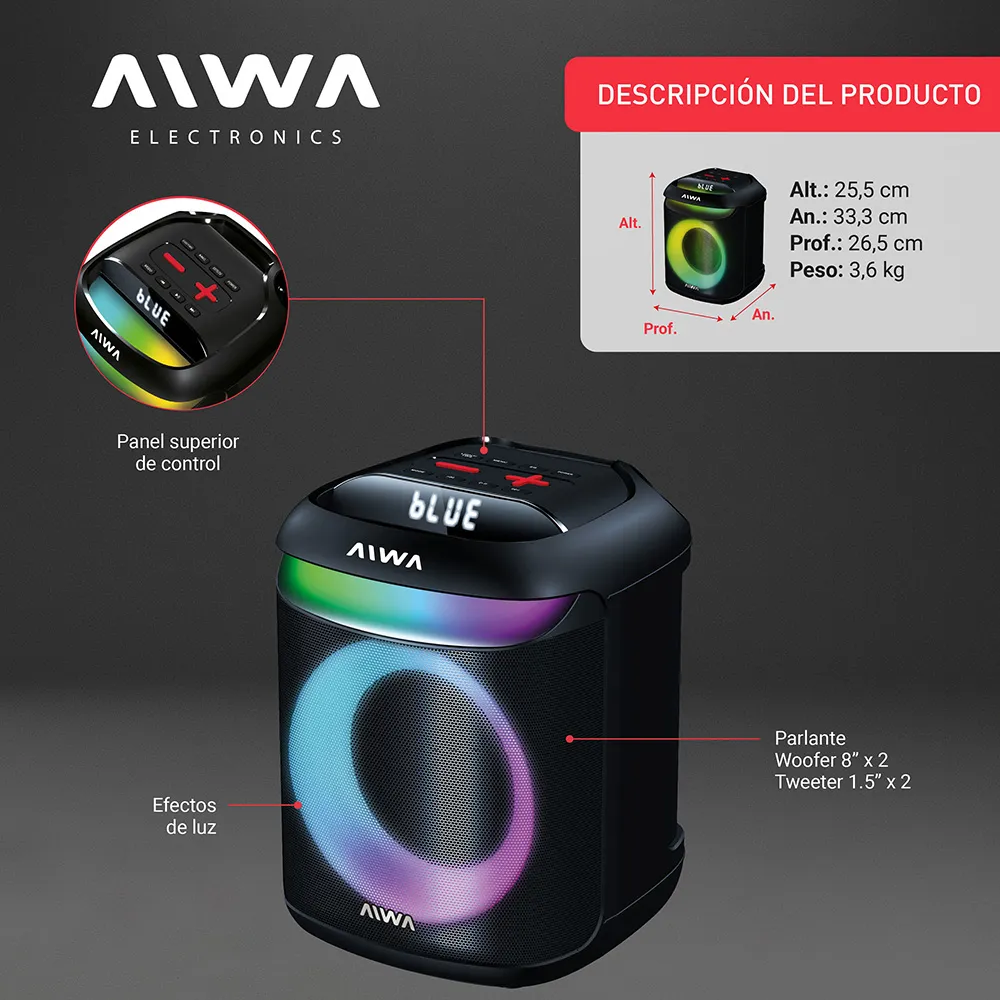 Parlante Bluetooth Aiwa AW-P180 con sonido potente y diseño portátil, ideal para música en casa, exteriores o reuniones.