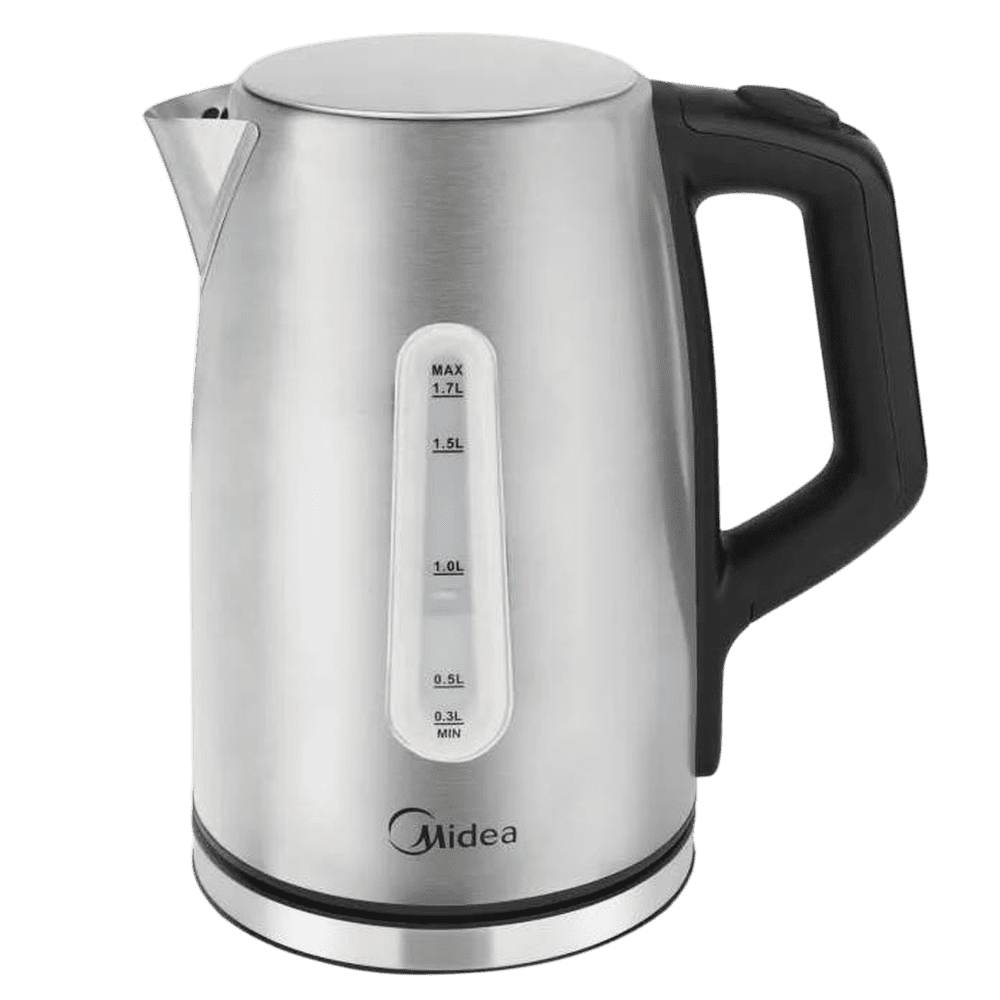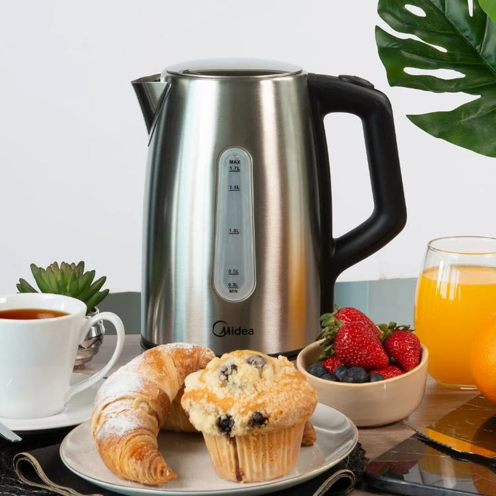 Pava eléctrica Midea de 1,7 L con cuerpo de acero inoxidable y alta potencia para hervir agua de forma rápida y segura. Ideal para uso diario en el hogar u oficina.