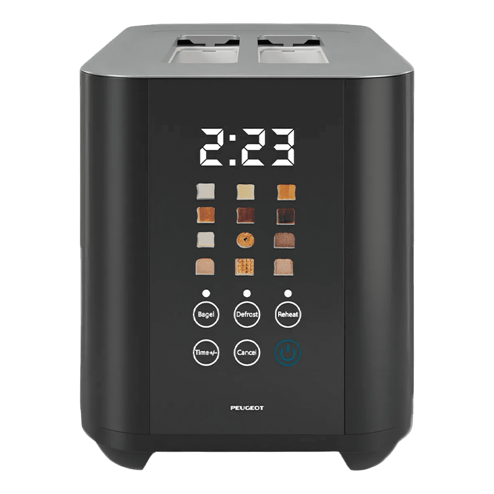 Tostadora digital Peugeot Limoges PB-T01 con capacidad para 2 rebanadas, 920 W de potencia, 6 niveles de tostado, panel táctil con temporizador y bandeja de migas removible. Diseño elegante en acero inoxidable para una cocina moderna y funcional.