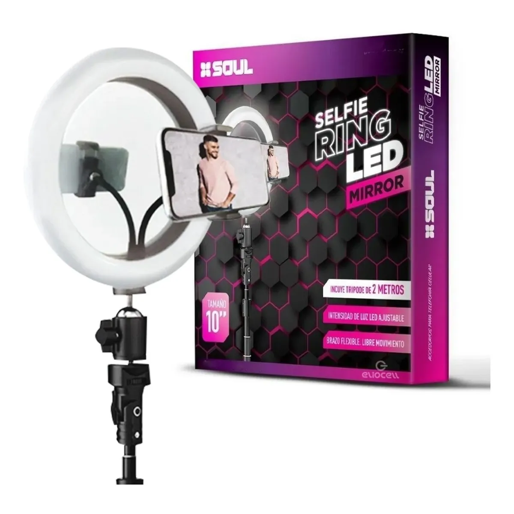 Kit aro de luz 25 cm + trípode de 2 m Soul con soporte para celular, brillo ajustable y tres modos de iluminación para streaming, maquillaje y contenido.
